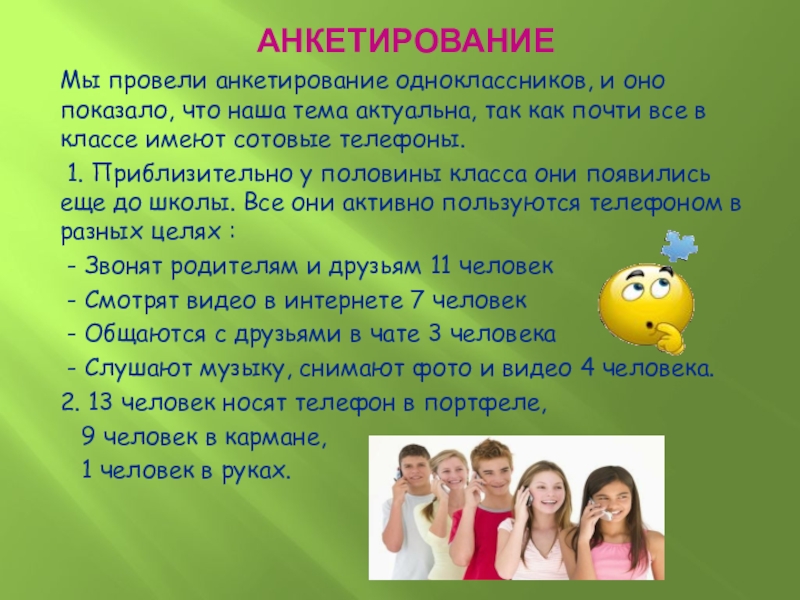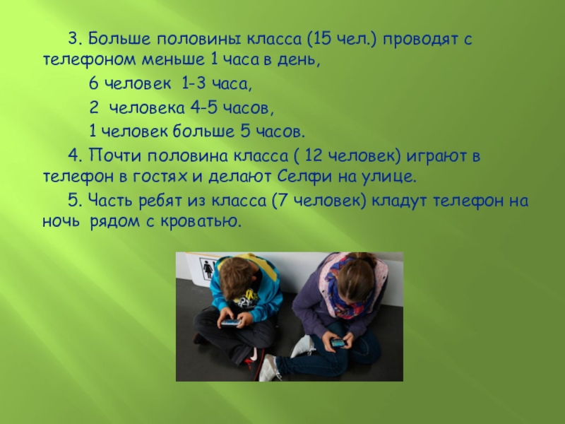 1. Приблизительно у половины класса они появились еще до школы. Все они активно пользуются телефоном в разных целях :