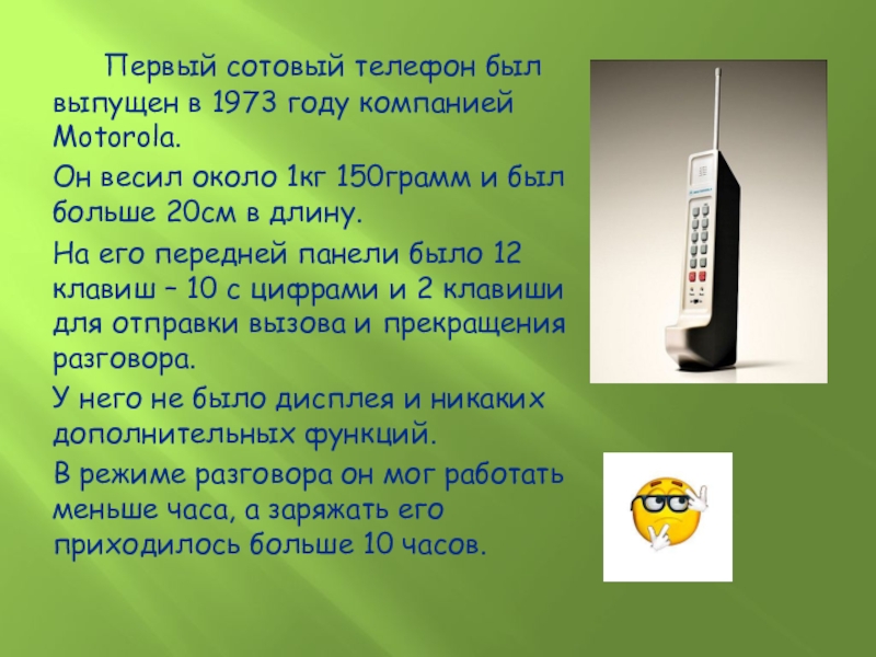 Слайд 5 Первый сотовый телефон был выпущен в 1973 году