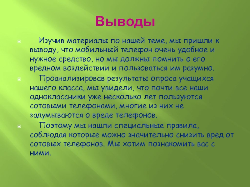 что мобильный телефон очень удобное и нужное средство, но мы должны помнить о его вредном воздействии и пользоваться им разумно.