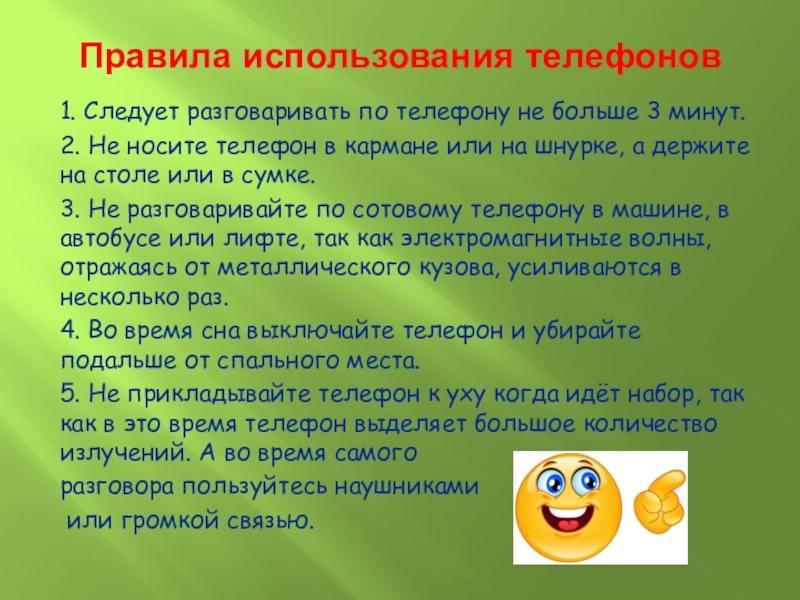 1. Следует разговаривать по телефону не больше 3 минут.