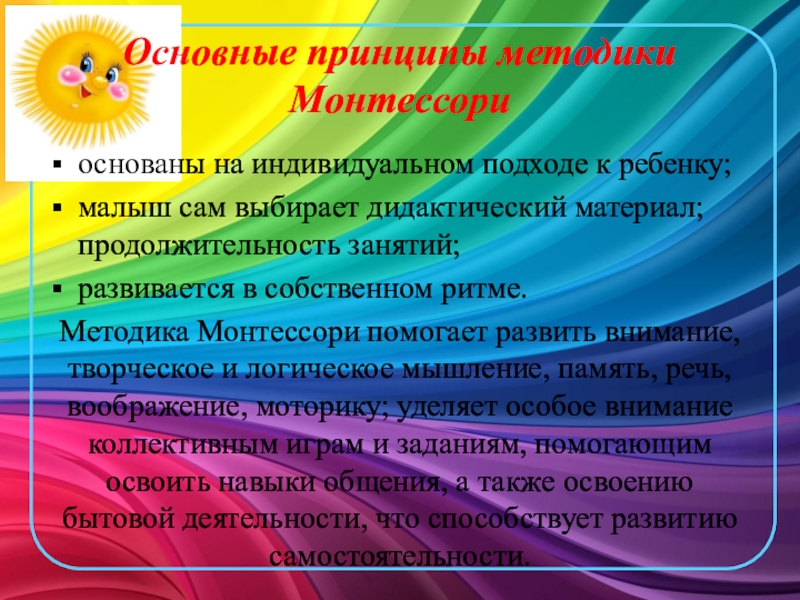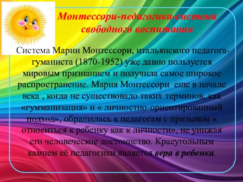 мировым признанием и получила самое широкое распространение. Мария Монтессори еще в начале века , когда не существовало таких терминов, как «гумманизация» и « личностно-ориентированный подход», обращалась к педагогам с призывом « относиться к ребенку как к личности», не унижая его человеческое достоинство. Краеугольным камнем её педагогики является вера в ребенка.