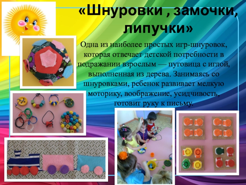 детской потребности в подражании взрослым — пуговица с иглой, выполненная из дерева. Занимаясь со шнуровками, ребенок развивает мелкую моторику, воображение, усидчивость, готовит руку к письму.