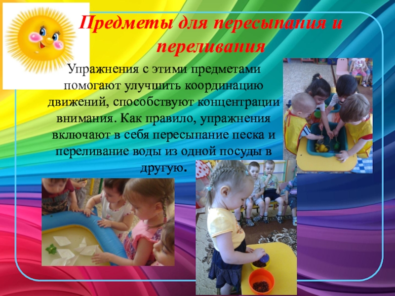 движений, способствуют концентрации внимания. Как правило, упражнения включают в себя пересыпание песка и переливание воды из одной посуды в другую.