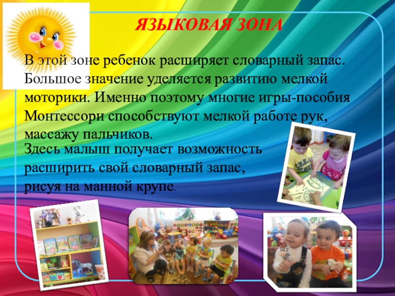 В этой зоне ребенок расширяет словарный запас.Большое значение уделяется развитию