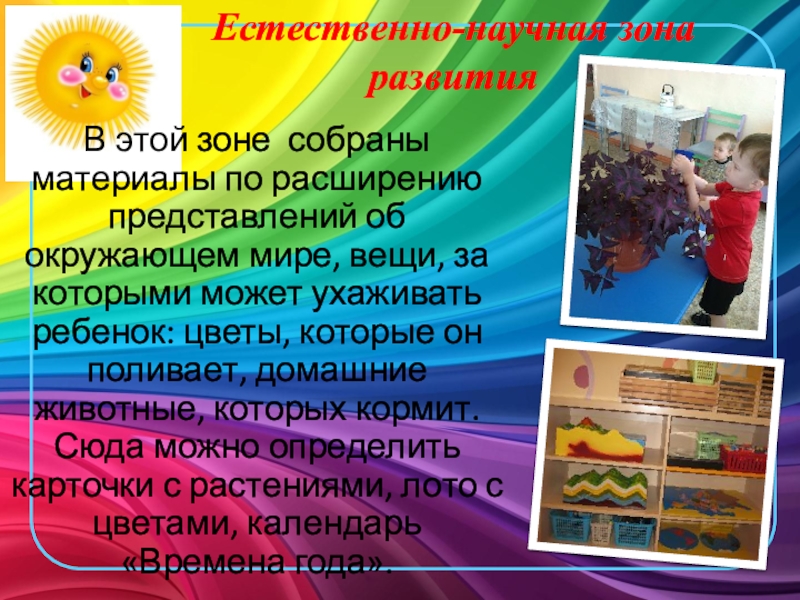 окружающем мире, вещи, за которыми может ухаживать ребенок: цветы, которые он поливает, домашние животные, которых кормит. Сюда можно определить карточки с растениями, лото с цветами, календарь «Времена года».