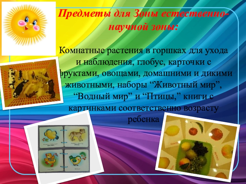 наблюдения, глобус, карточки с фруктами, овощами, домашними и дикими животными, наборы “Животный мир”, “Водный мир” и “Птицы,” книги с картинками соответственно возрасту ребенка