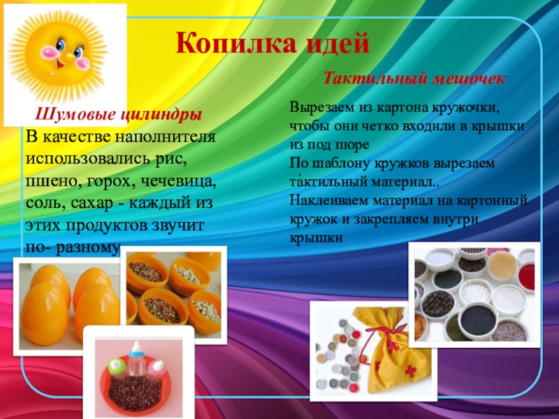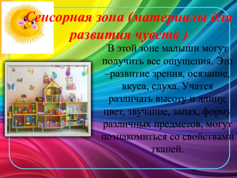 получить все ощущения. Это –развитие зрения, осязание, вкуса, слуха. Учатся различать высоту и длину, цвет, звучание, запах, форму различных предметов, могут познакомиться со свойствами тканей.