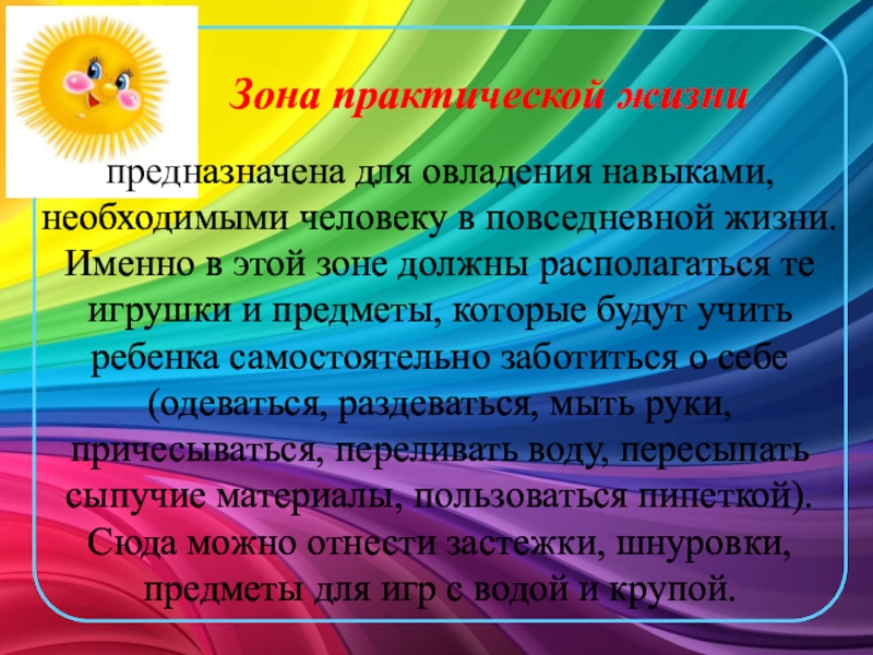 Именно в этой зоне должны располагаться те игрушки и предметы, которые будут учить ребенка самостоятельно заботиться о себе (одеваться, раздеваться, мыть руки, причесываться, переливать воду, пересыпать сыпучие материалы, пользоваться пипеткой). Сюда можно отнести застежки, шнуровки, предметы для игр с водой и крупой.