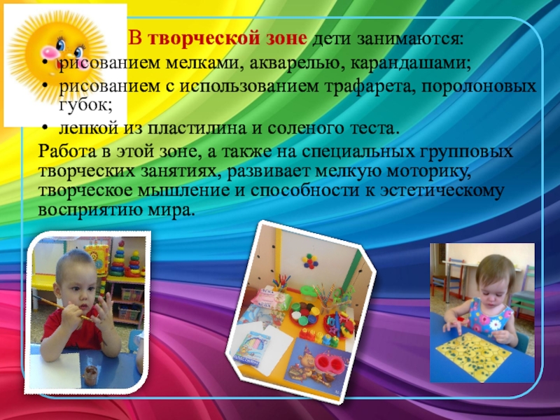 Работа в этой зоне, а также на специальных групповых творческих занятиях, развивает мелкую моторику, творческое мышление и способности к эстетическому восприятию мира.