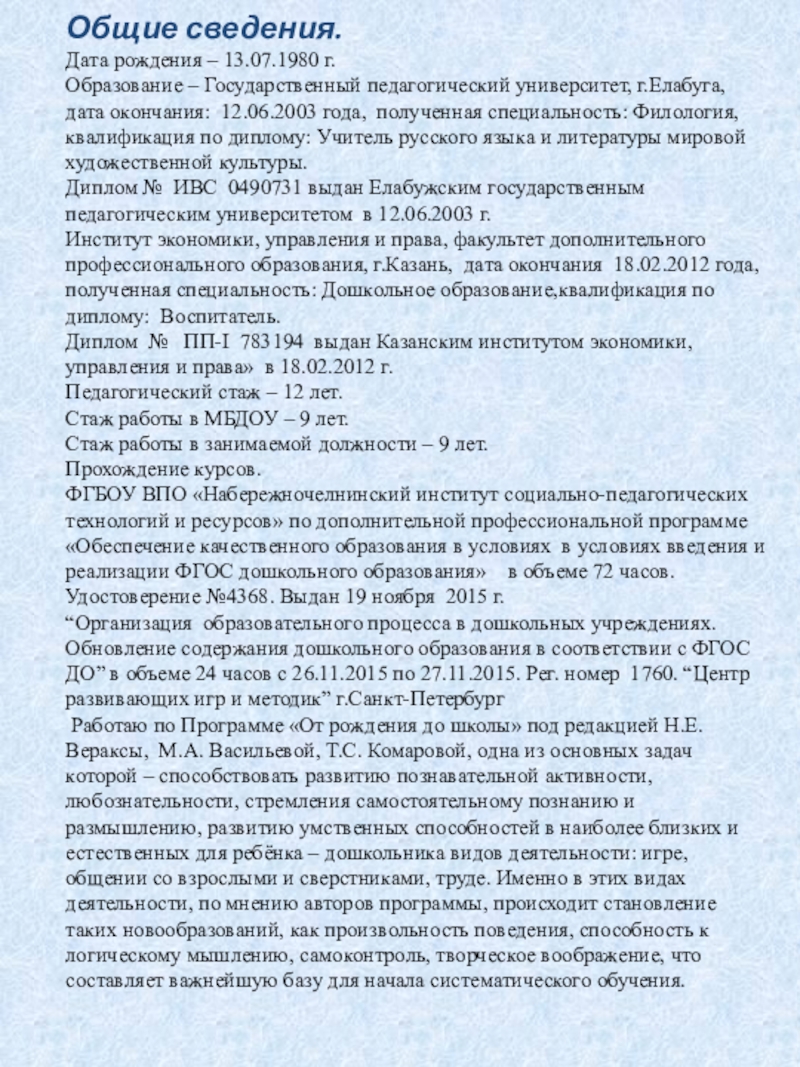 г.Елабуга, дата окончания: 12.06.2003 года, полученная специальность: Филология, квалификация по диплому: Учитель русского языка и литературы мировой художественной культуры.