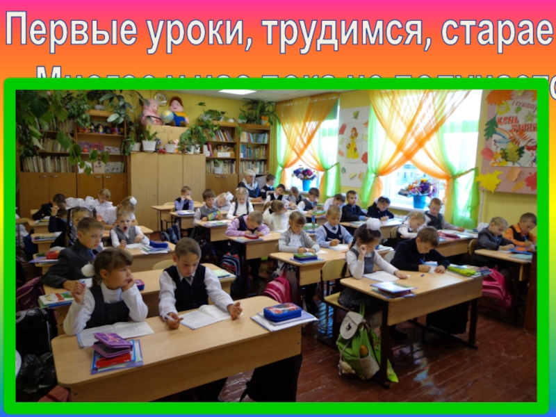 Слайд 10Первые уроки, трудимся, стараемся. Многое у нас пока не получается.