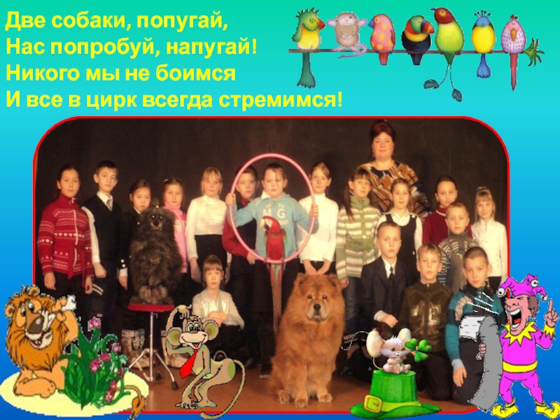 Две собаки, попугай, Нас попробуй, напугай! Никого мы не боимся И все в цирк всегда стремимся!