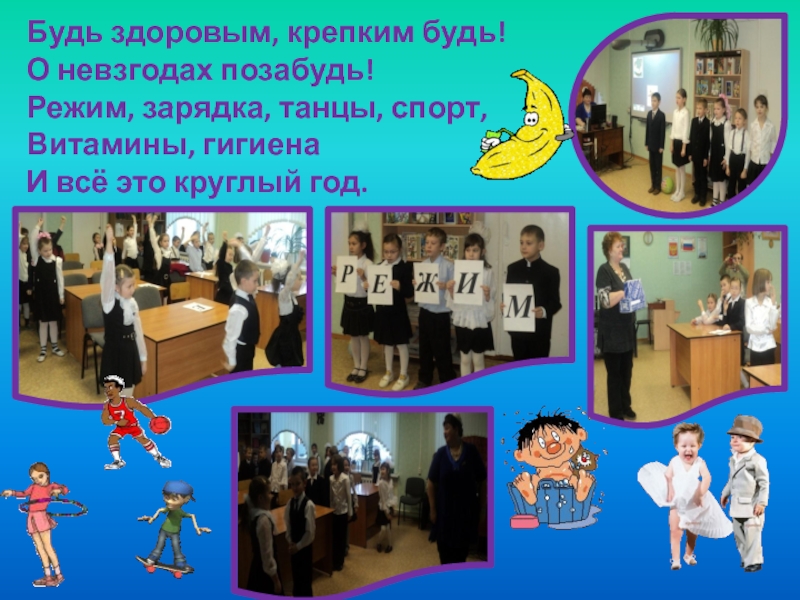 Слайд 6Будь здоровым, крепким будь! О невзгодах позабудь! Режим, зарядка, танцы, спорт, Витамины, гигиена И всё