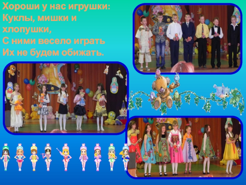 Хороши у нас игрушки: Куклы, мишки и хлопушки, С ними весело играть Их не будем обижать.