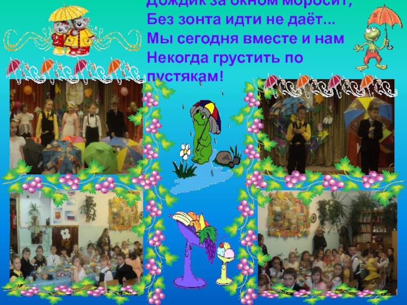 Слайд 5Дождик за окном моросит, Без зонта идти не даёт... Мы сегодня вместе