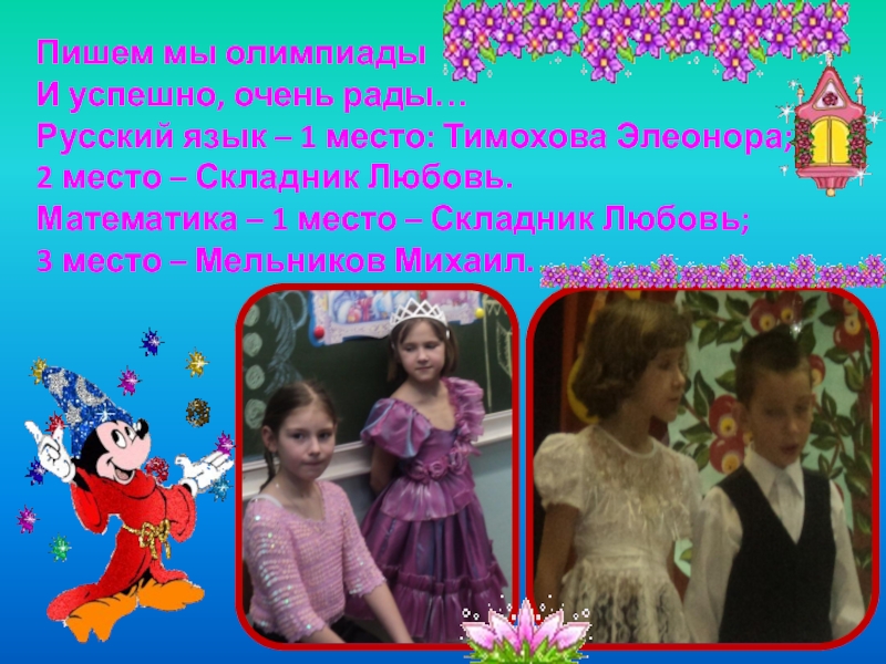 Элеонора; 2 место – Складник Любовь. Математика – 1 место – Складник Любовь; 3 место – Мельников Михаил.