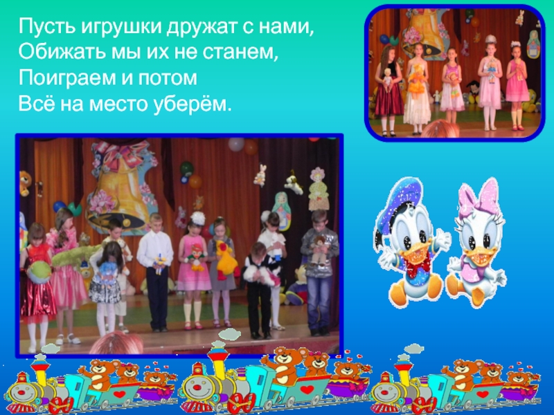Слайд 20Пусть игрушки дружат с нами, Обижать мы их не станем, Поиграем и потом Всё