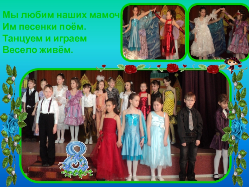 Мы любим наших мамочек Им песенки поём. Танцуем и играем Весело живём.