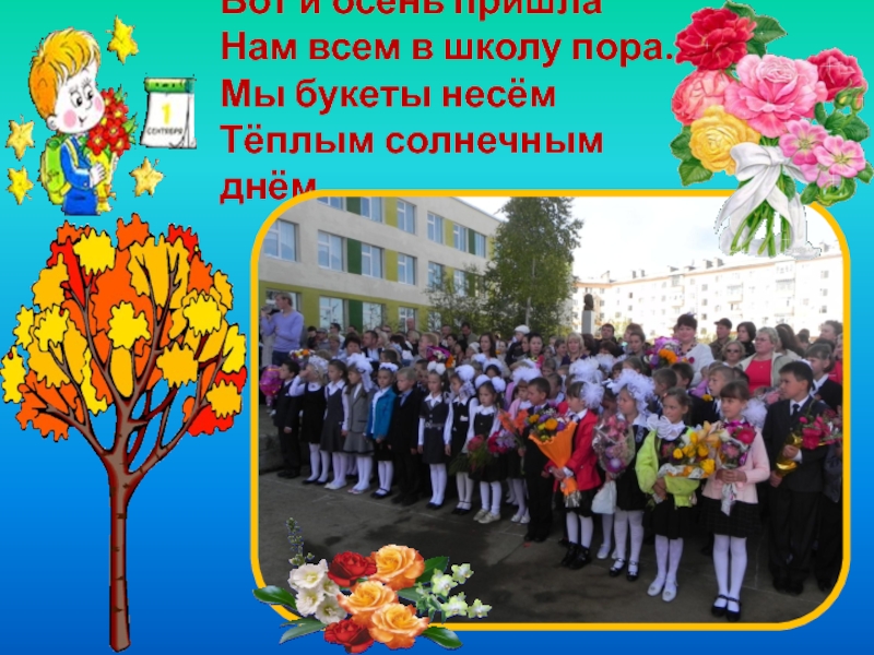 Вот и осень пришла Нам всем в школу пора. Мы букеты несём Тёплым солнечным днём.