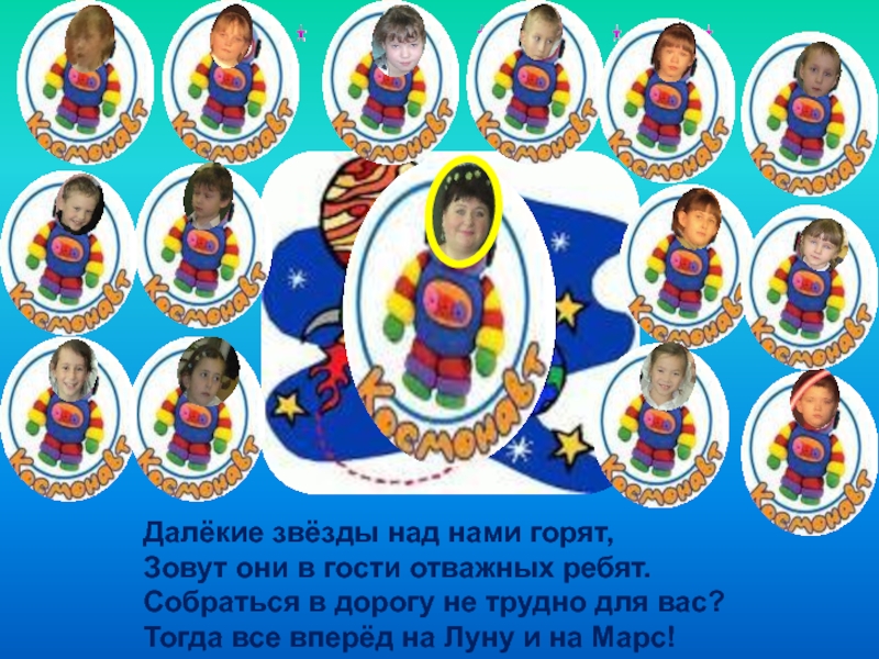 Далёкие звёзды над нами горят,Зовут они в гости отважных ребят.Собраться в дорогу не трудно для вас?Тогда все