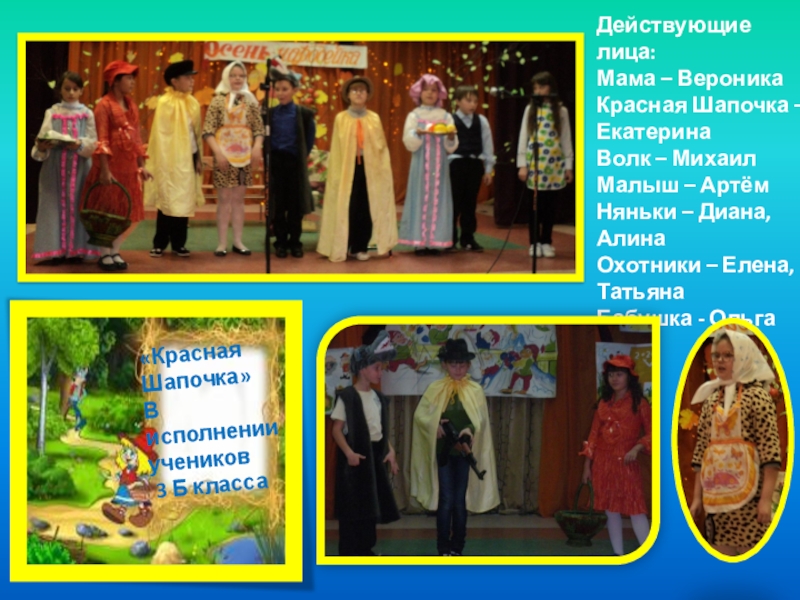 «Красная Шапочка»В исполнении учеников 3 Б классаДействующие лица:Мама – ВероникаКрасная Шапочка – ЕкатеринаВолк – МихаилМалыш – АртёмНяньки