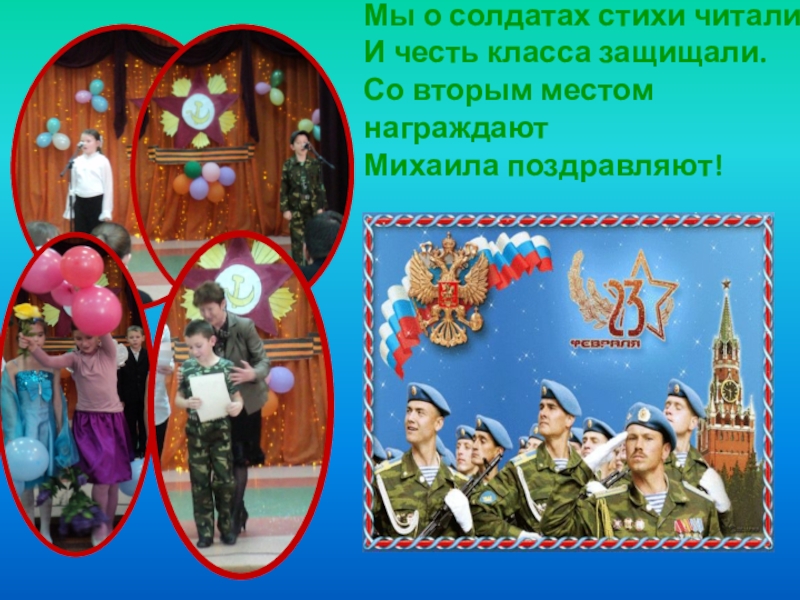 Слайд 22Мы о солдатах стихи читали И честь класса защищали. Со вторым местом награждают Михаила