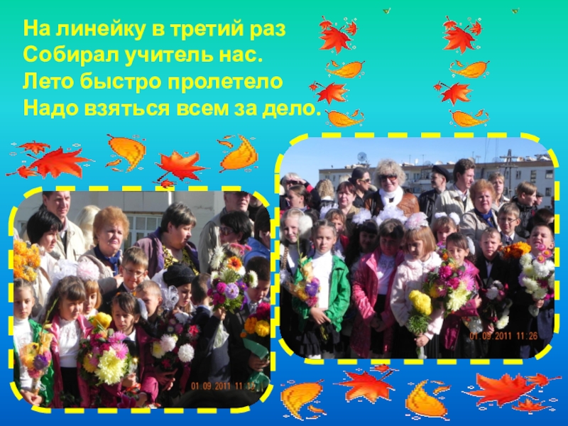На линейку в третий раз Собирал учитель нас. Лето быстро пролетело Надо взяться всем за дело.