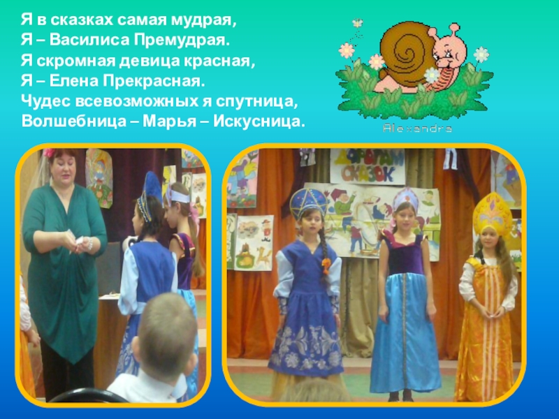 Я в сказках самая мудрая, Я – Василиса Премудрая. Я скромная девица красная, Я – Елена Прекрасная.