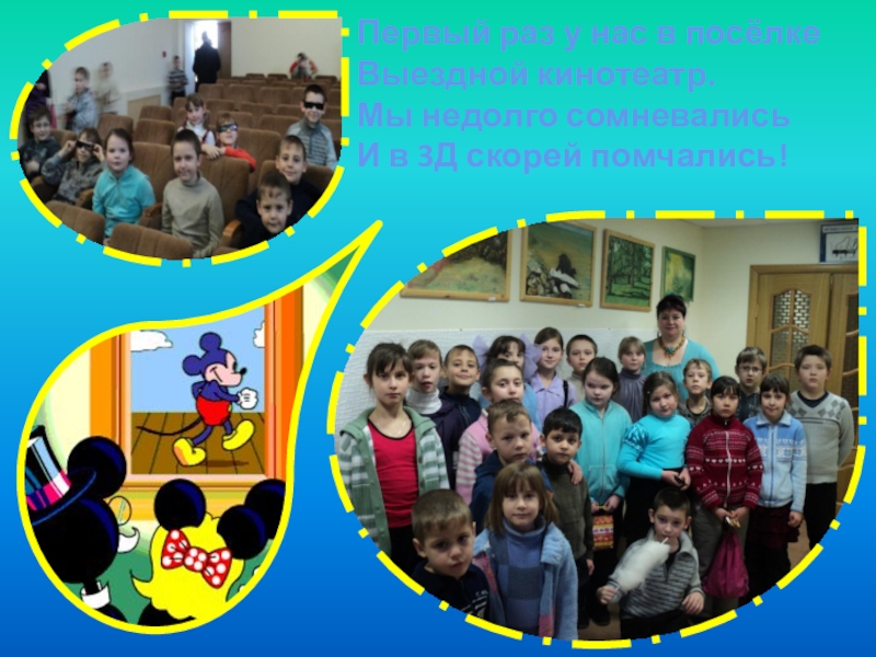 Слайд 19Первый раз у нас в посёлке Выездной кинотеатр. Мы недолго сомневались И в 3Д