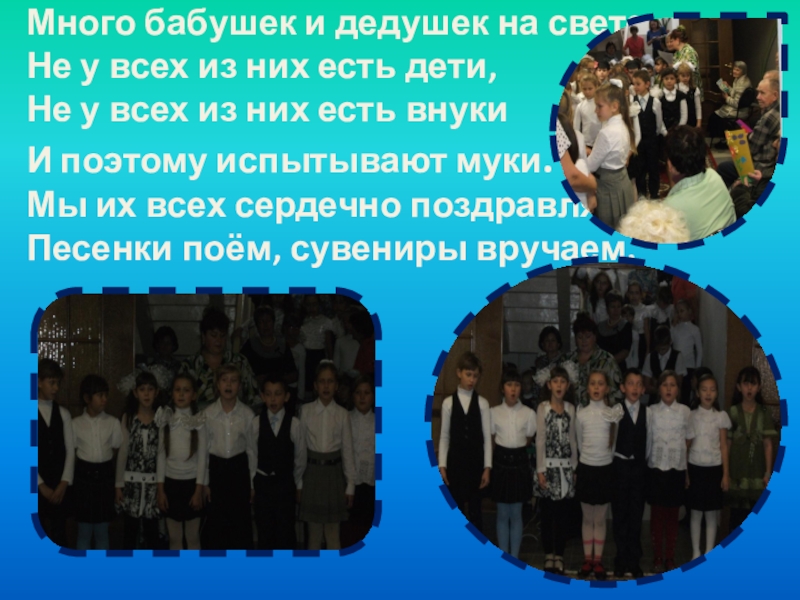 дети, Не у всех из них есть внуки И поэтому испытывают муки. Мы их всех сердечно поздравляем Песенки поём, сувениры вручаем.
