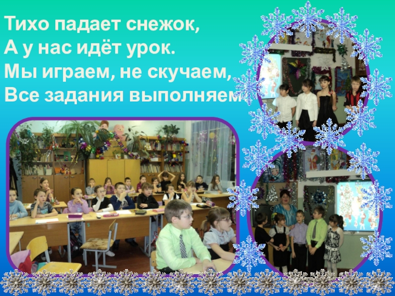 Тихо падает снежок, А у нас идёт урок. Мы играем, не скучаем, Все задания выполняем!