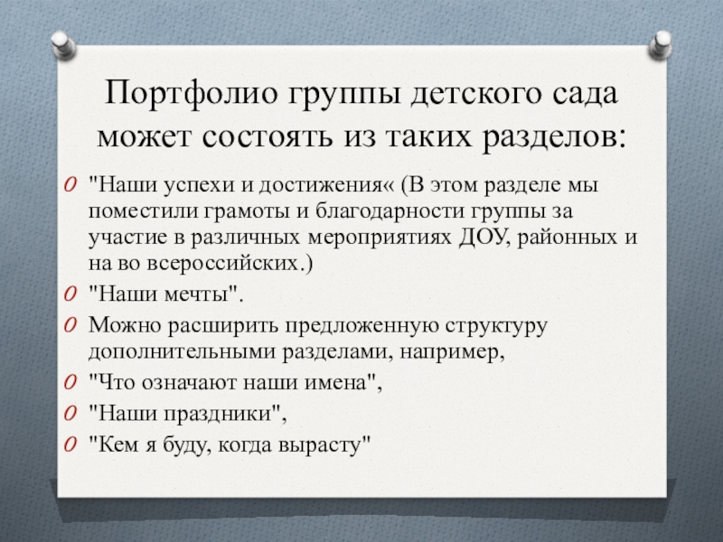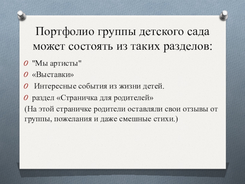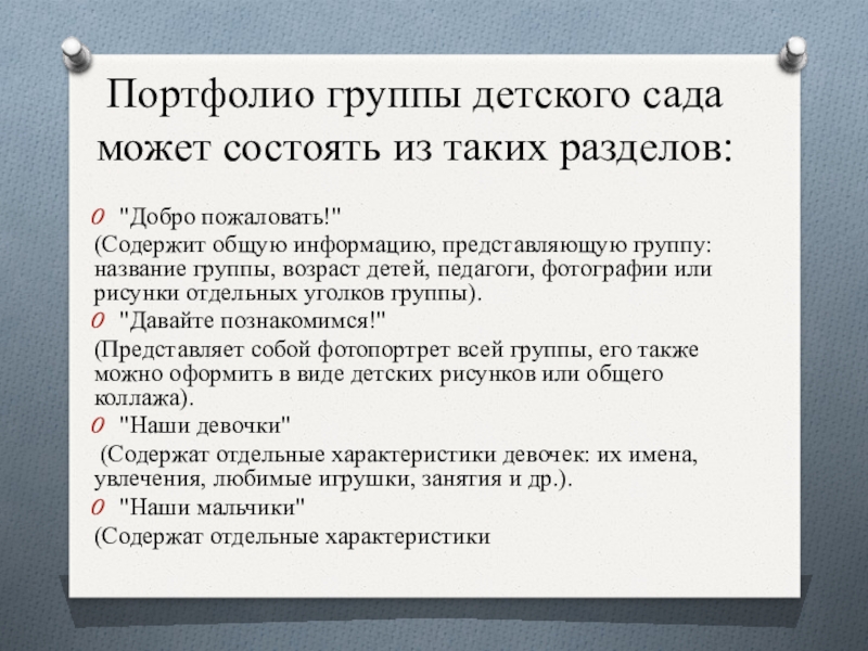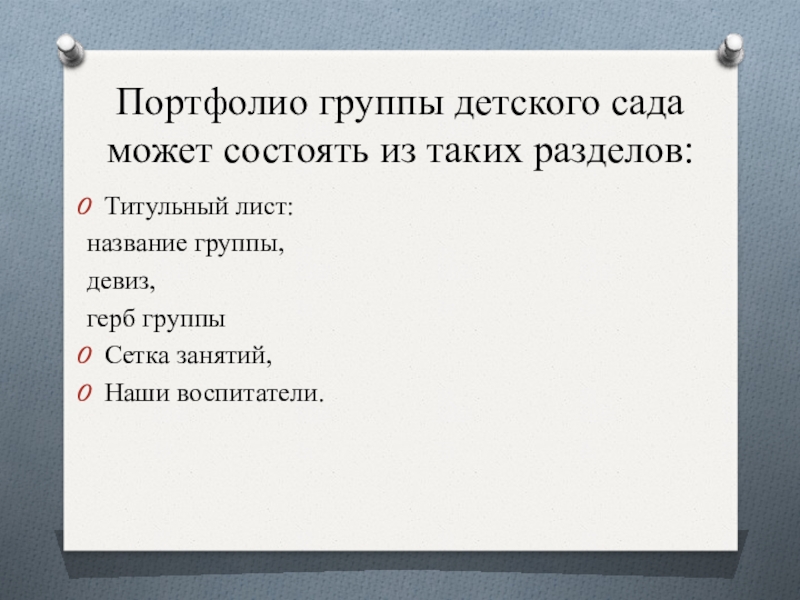 Слайд 12Портфолио группы детского сада может состоять из таких разделов: