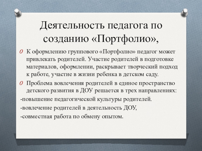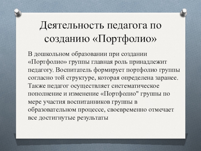 Слайд 13Деятельность педагога по созданию «Портфолио»
