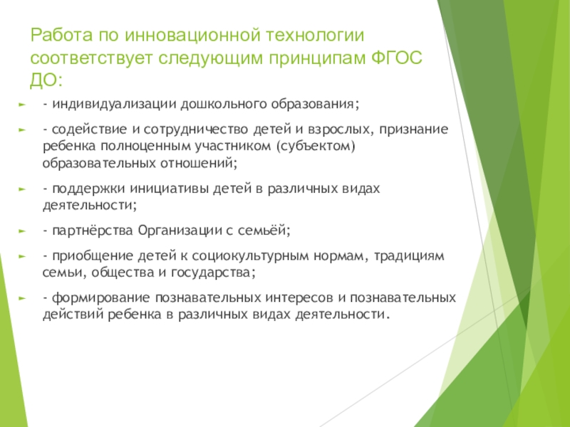 Слайд 3Работа по инновационной технологии соответствует следующим принципам ФГОС ДО: