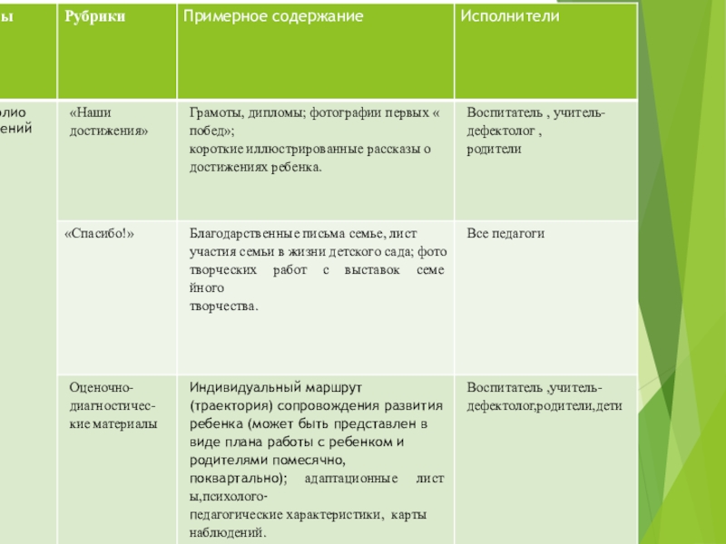 В формировании портфолио принимают участие ребенок, воспитатели, дефектолог и родители воспитанников.