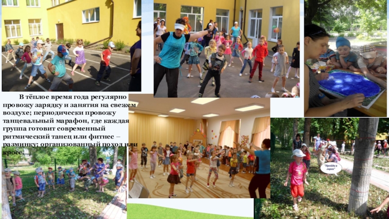 свежем воздухе; периодически провожу танцевальный марафон, где каждая группа готовит современный ритмический танец или фитнес – разминку; организованный поход или кросс.