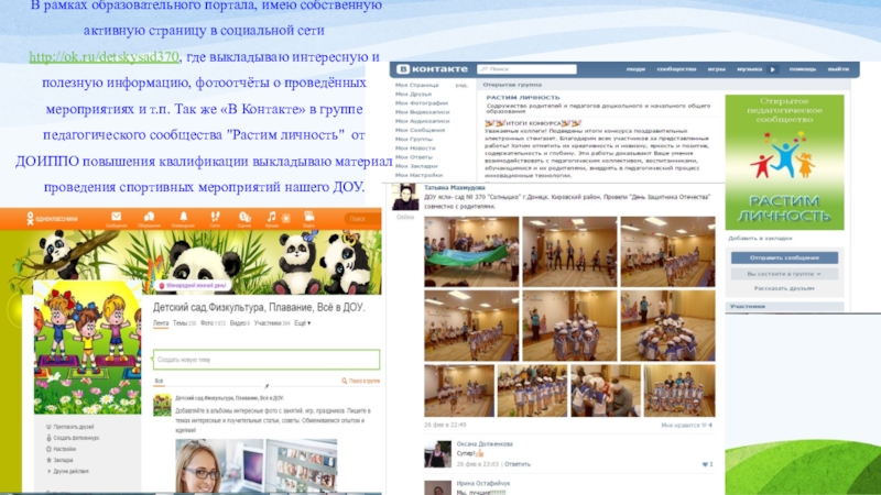 сети http://ok.ru/detskysad370, где выкладываю интересную и полезную информацию, фотоотчёты о проведённых мероприятиях и т.п. Так же «В Контакте» в группе педагогического сообщества "Растим личность" от ДОИППО повышения квалификации выкладываю материал проведения спортивных мероприятий нашего ДОУ.