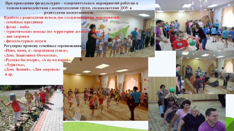Слайд 21При проведении физкультурно – оздоровительных мероприятий работаю в тесном взаимодействии с