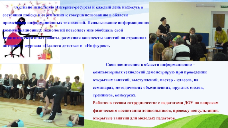 стремления к совершенствованию в области применения информационных технологий. Использование информационно - коммуникационных технологий позволяет мне обобщать свой педагогический опыт работы, размещая конспекты занятий на страницах интернет – журнала «Планета детства» и «Инфоурок».
