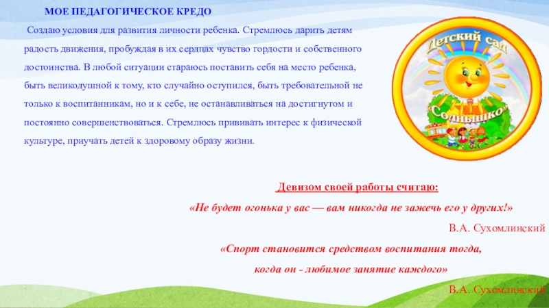 детям радость движения, пробуждая в их сердцах чувство гордости и собственного достоинства. В любой ситуации стараюсь поставить себя на место ребенка, быть великодушной к тому, кто случайно оступился, быть требовательной не только к воспитанникам, но и к себе, не останавливаться на достигнутом и постоянно совершенствоваться. Стремлюсь прививать интерес к физической культуре, приучать детей к здоровому образу жизни.