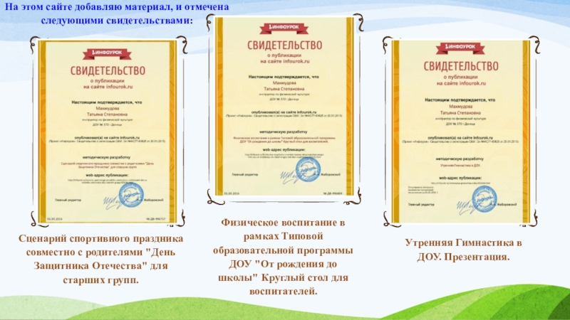 Слайд 17Сертификат о создании сайта инструктора по физической культуре на площадке Инфоурок.