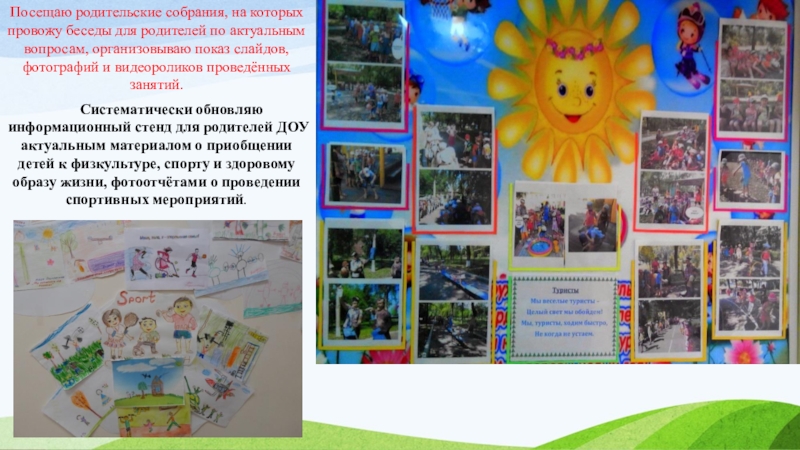 Систематически обновляю информационный стенд для родителей ДОУ актуальным материалом о приобщении детей к физкультуре, спорту и здоровому образу жизни, фотоотчётами о проведении спортивных мероприятий.