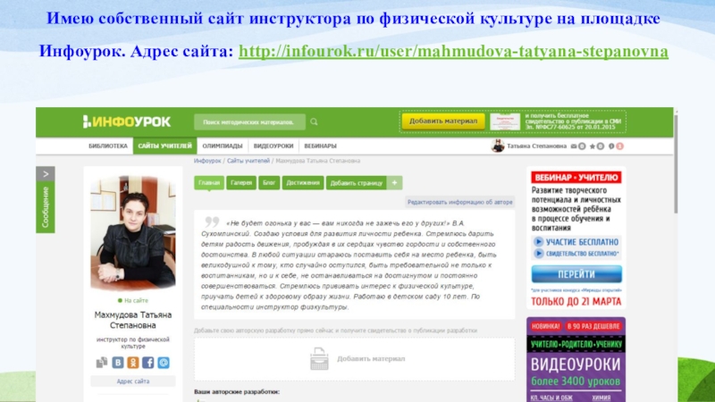 Слайд 16Имею собственный сайт инструктора по физической культуре на площадке Инфоурок. Адрес