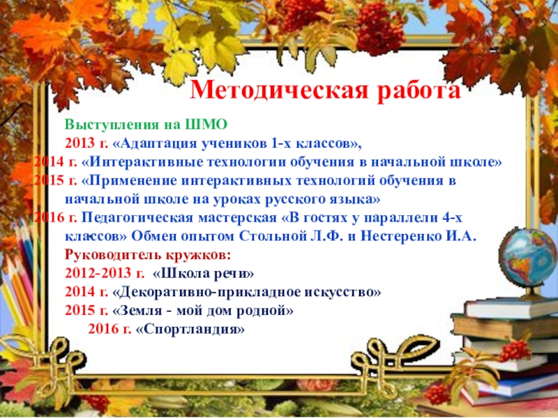 Методическая работаВыступления на ШМО 2013 г. «Адаптация учеников 1-х классов», г. «Интерактивные технологии обучения в начальной школе»