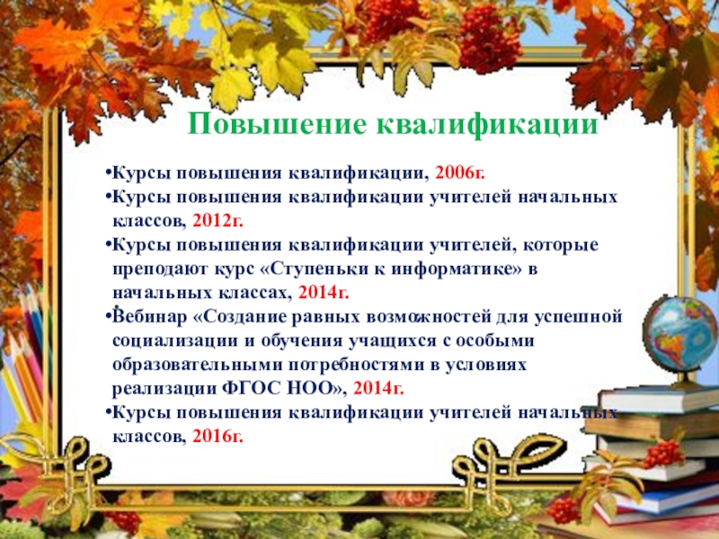 Повышение квалификацииКурсы повышения квалификации, 2006г.Курсы повышения квалификации учителей начальных классов, 2012г.Курсы повышения квалификации учителей, которые преподают курс