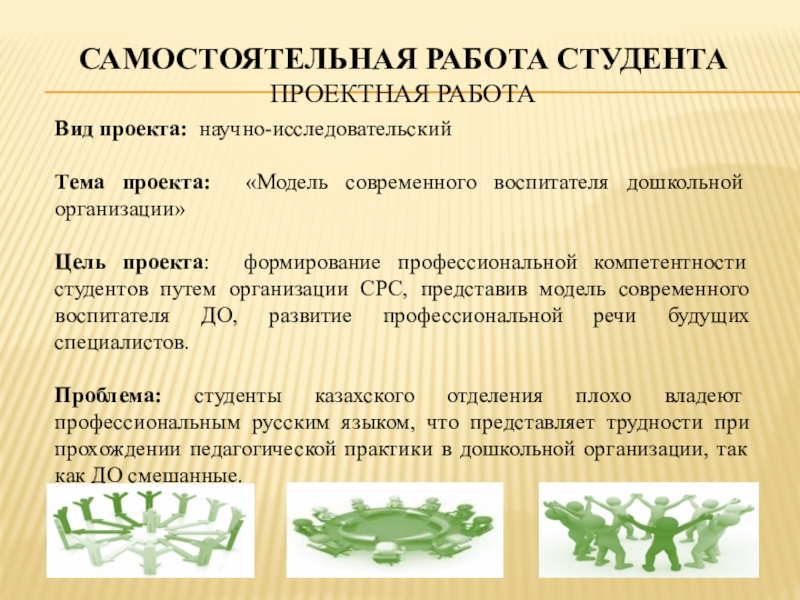 Проблема: студенты казахского отделения плохо владеют профессиональным русским языком, что представляет трудности при прохождении педагогической практики в дошкольной организации, так как ДО смешанные.