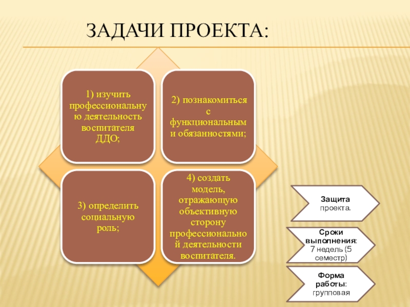Цель проекта: формирование профессиональной компетентности студентов путем организации СРС, представив модель современного воспитателя ДО, развитие профессиональной речи будущих специалистов.