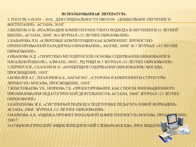 8.Кайкенова Ж.К. «Системный подход к подготовке педагога новой формации» Астана, 2006г. журнал «12-летнее образование»