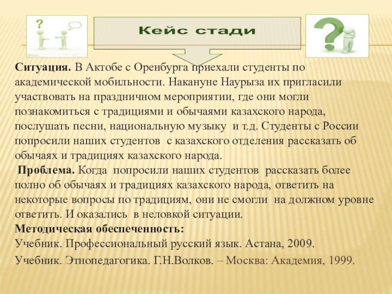 Проблема. Когда попросили наших студентов рассказать более полно об обычаях и традициях казахского народа, ответить на некоторые вопросы по традициям, они не смогли на должном уровне ответить. И оказались в неловкой ситуации.