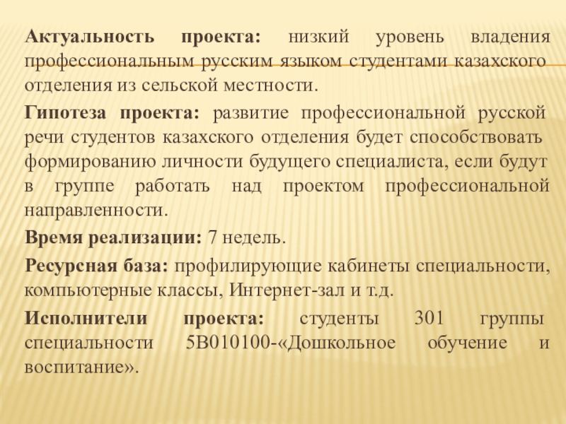 Гипотеза проекта: развитие профессиональной русской речи студентов казахского отделения будет способствовать формированию личности будущего специалиста, если будут в группе работать над проектом профессиональной направленности.